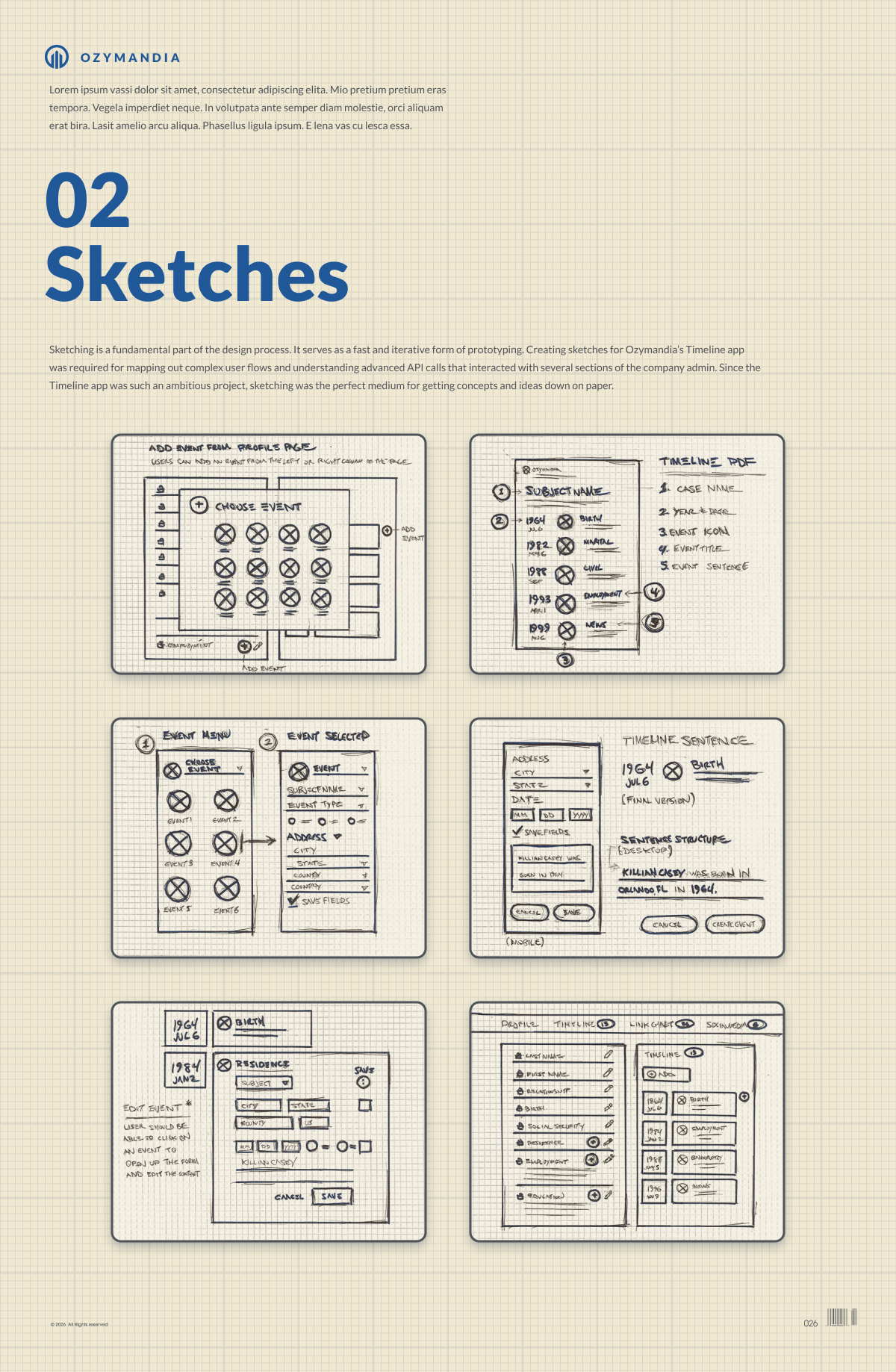 Sketching is a fundamental part of the design process. It serves as a fast and iterative form of prototyping. Creating sketches for Ozymandia’s Timeline app was required for mapping out complex user flows and understanding advanced API calls that interacted with several sections of the company admin. Since the Timeline app was such an ambitious project, sketching was the perfect medium for getting concepts and ideas down on paper.
