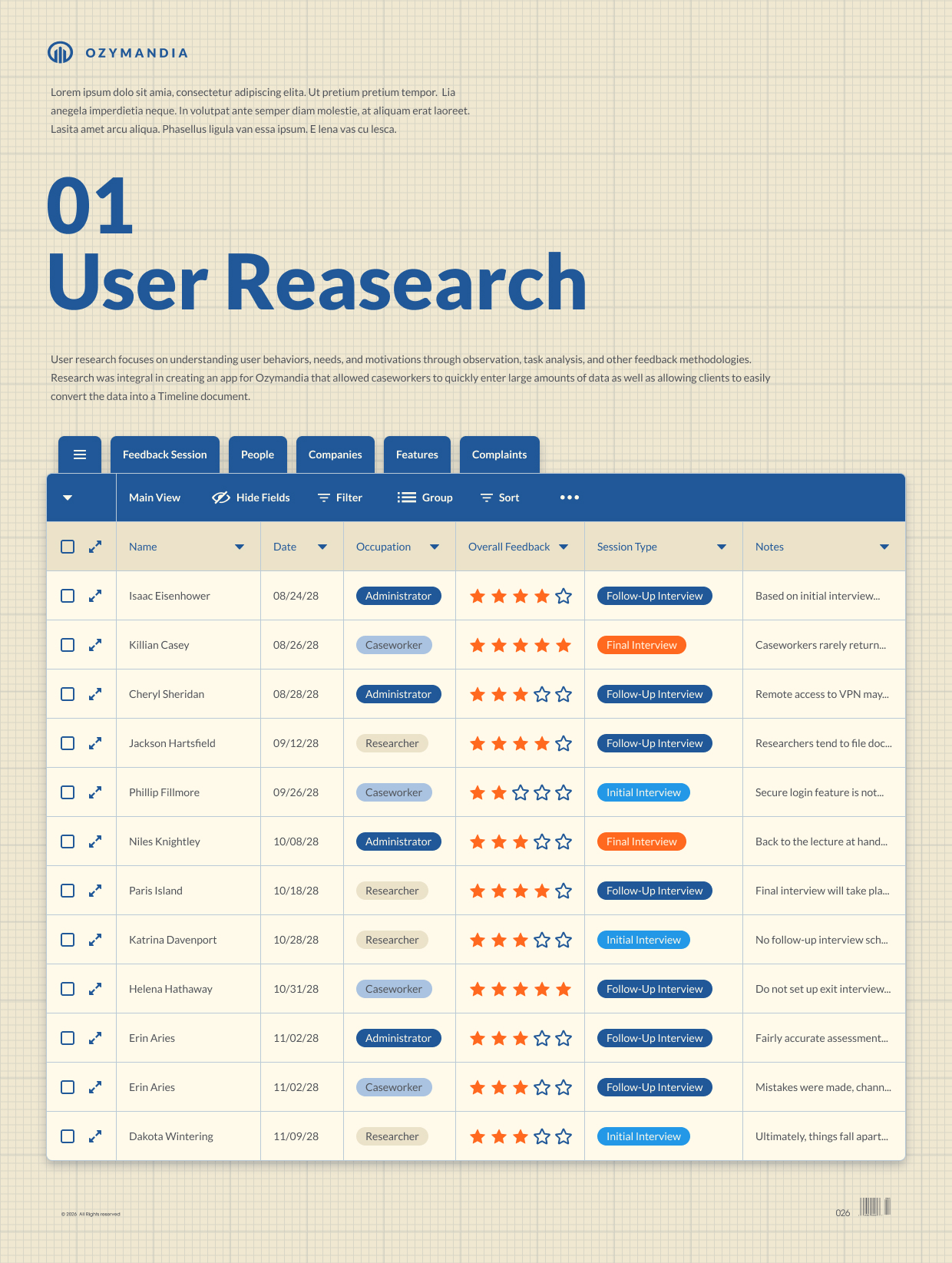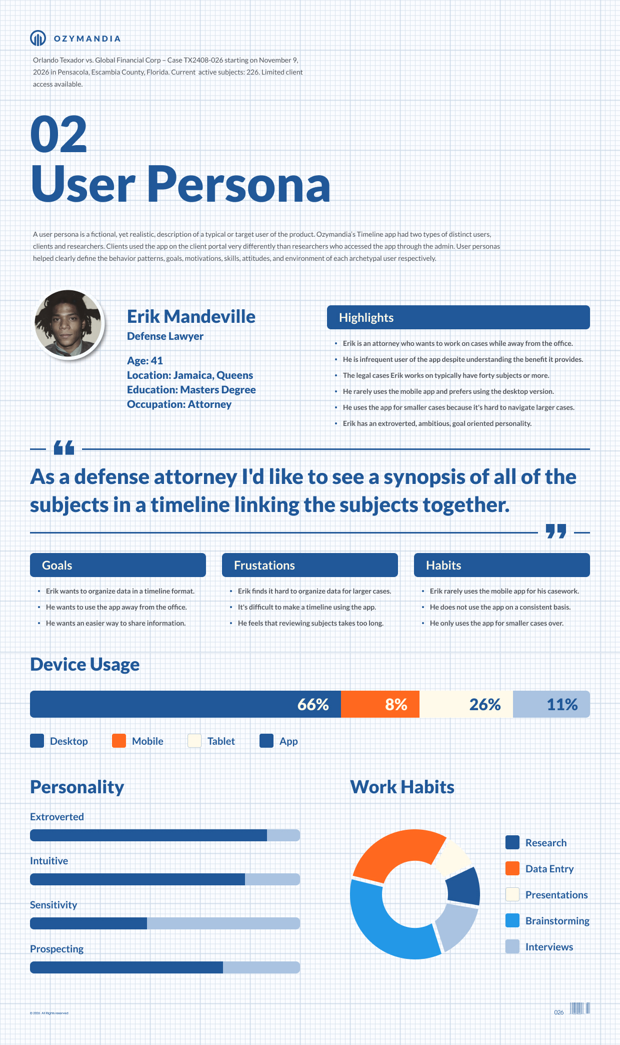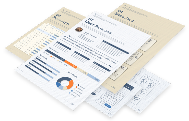 User research focuses on understanding user behaviors, needs, and motivations through observation, task analysis, and other feedback methodologies. Research was integral in creating an app for Ozymandia that allowed caseworkers to quickly enter large amounts of data as well as allowing clients to easily convert the data into a Timeline document.