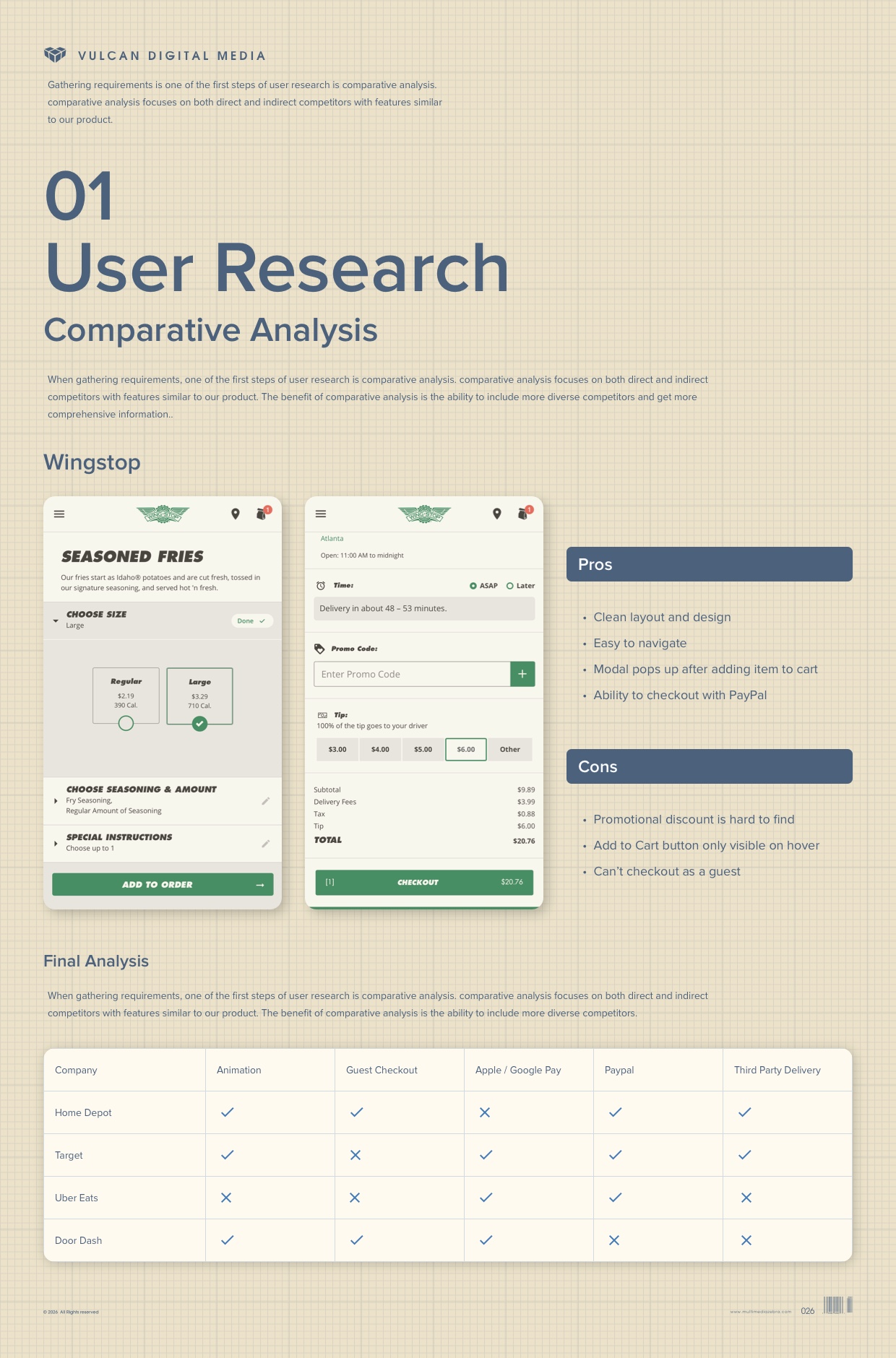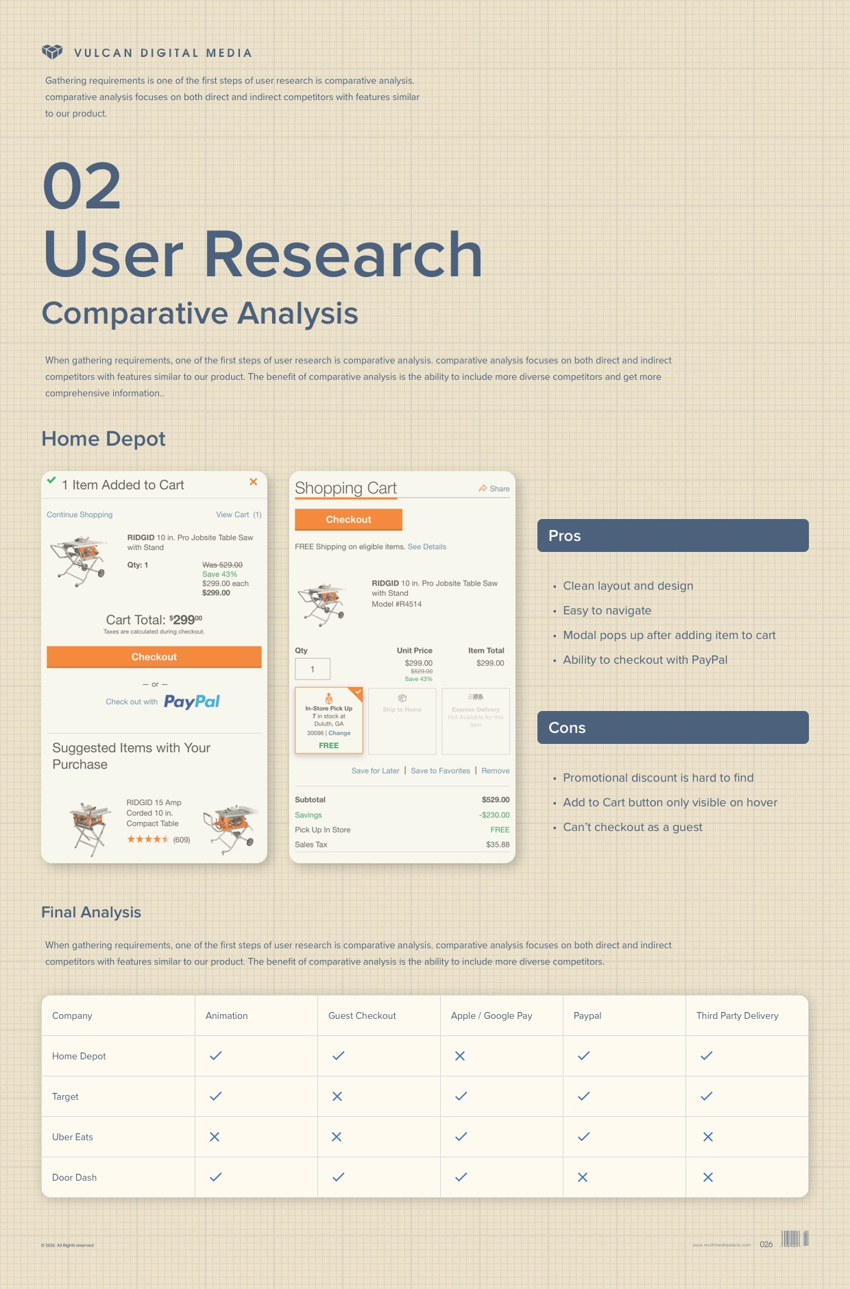 When gathering requirements, one of the first steps of user research is comparative analysis. Comparative analysis focuses on both direct and indirect competitors with features similar to our product. The benefit of comparative analysis is the ability to include more diverse competitors and get more comprehensive information. Companies with robust ordering and delivery capacities such as Home Depot, Target, Uber Eats and Door Dash were all thoroughly examined before creating Vulcan Digital Media’s Quick Order and Third Party Delivery features.